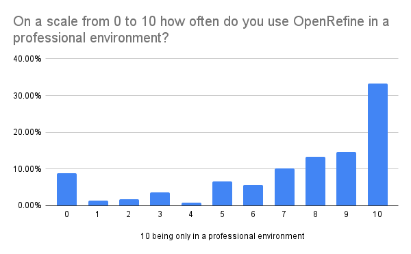 Last year, 85.1% of respondents indicated that they primarily use OpenRefine for work. This year, we provided a scale to measure the proportion of their usage in a professional environment. The results are consistent with those from 2022, as 71% of respondents reported using OpenRefine primarily in a professional setting (at least 70% of the time).